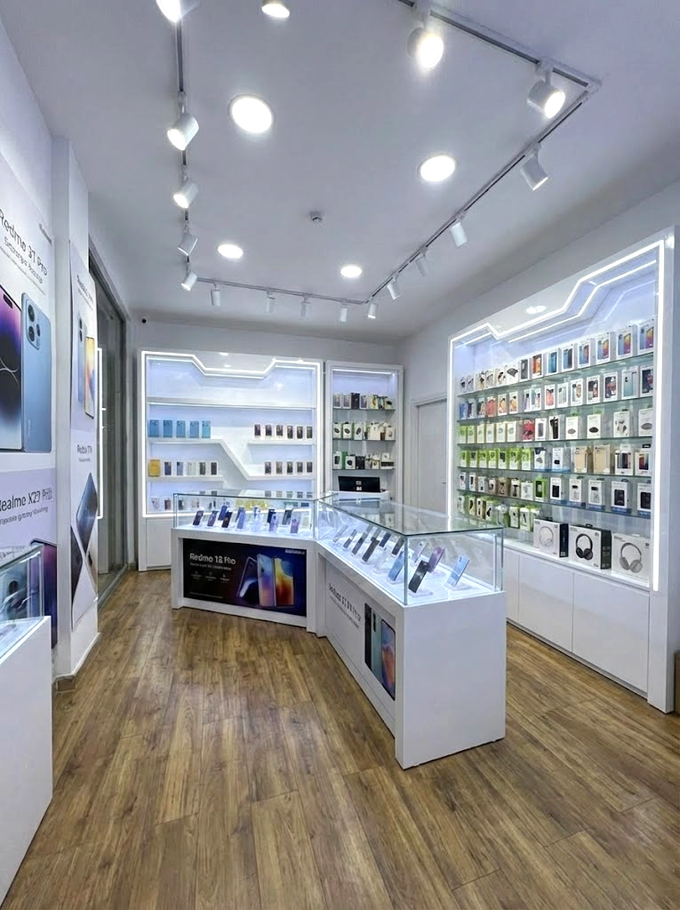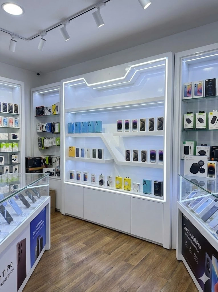 The 2-meter-wide structure offers a generous display surface enhanced by an LED backlighting system that captures the customer's attention and highlights the details of phone cases, smartphones, and high-tech accessories. The central design with a diagonal geometric cut breaks up the monotony of traditional shelves, giving your store a dynamic and cutting-edge look.