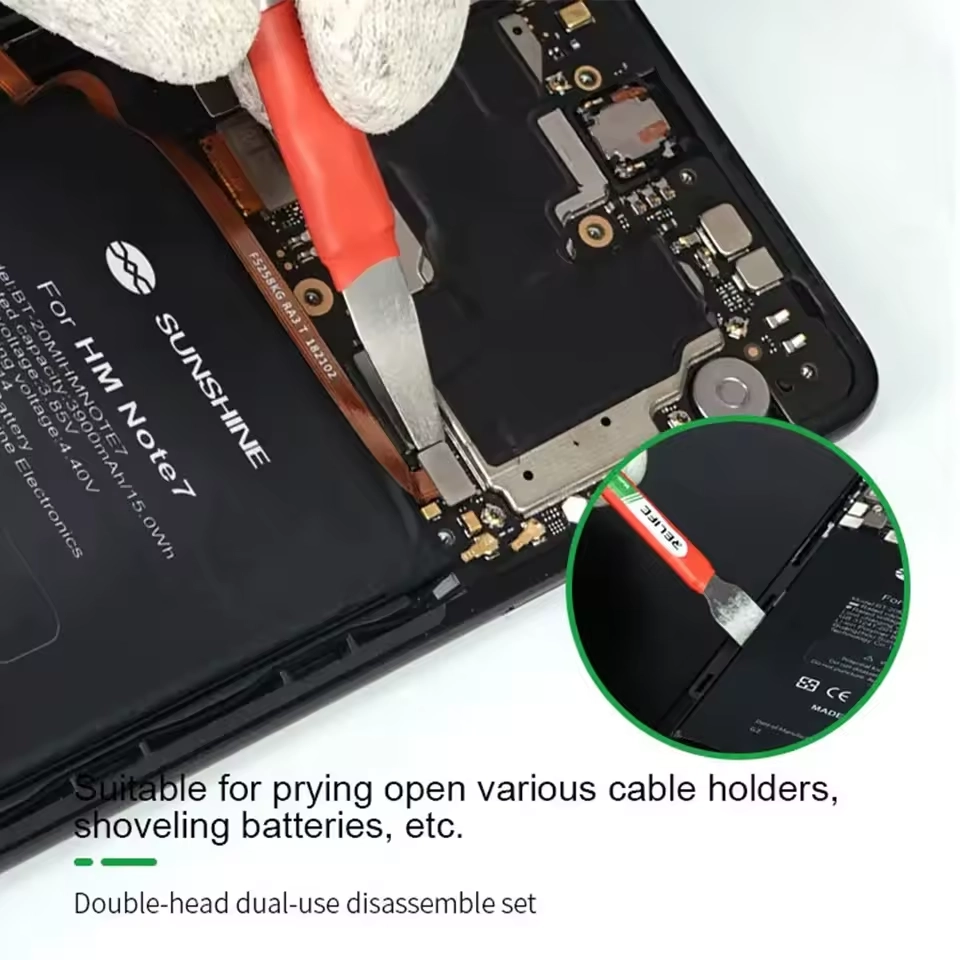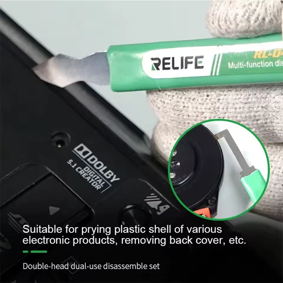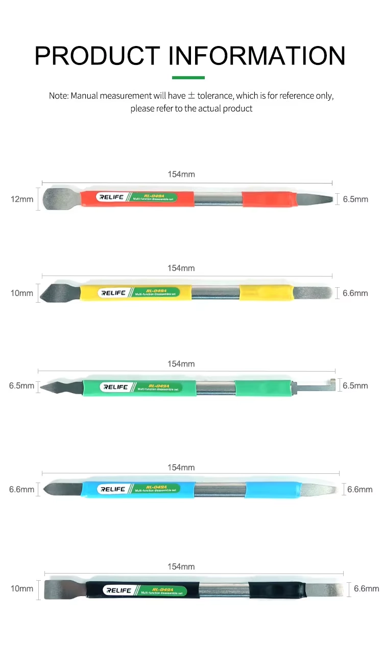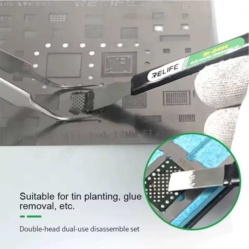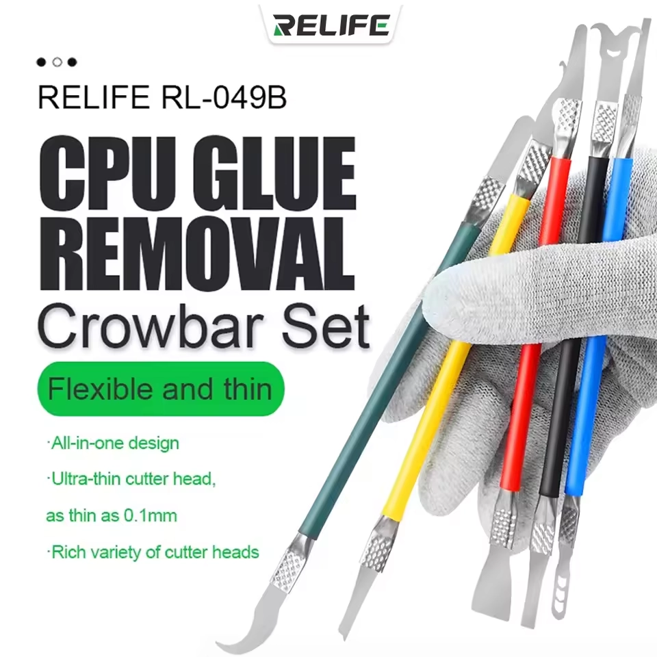 The Relife RL-049A is a kit consisting of 5 dual-head tools (10 functions in total), offering maximum versatility for every stage of repair, from removing glass back covers to delicate CPU prying. Ultra-thin, high-tenacity steel allows for easy access without damaging components.