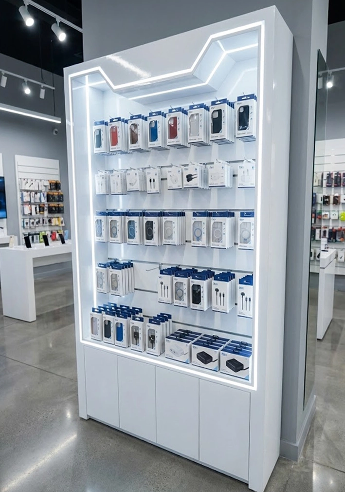 Visibilità Massima e Design Moderno: Con un'altezza di 2,4 metri, questo espositore sfrutta al massimo le pareti del tuo negozio, trasformandole in un'area di vendita ad alto impatto. La struttura bianca, arricchita da un sistema di illuminazione LED perimetrale integrata, cattura l'attenzione del cliente e fa risaltare i colori e i dettagli dei blister dei tuoi prodotti (cover, cavi, caricatori, auricolari), conferendo un aspetto ordinato all'intero ambiente.