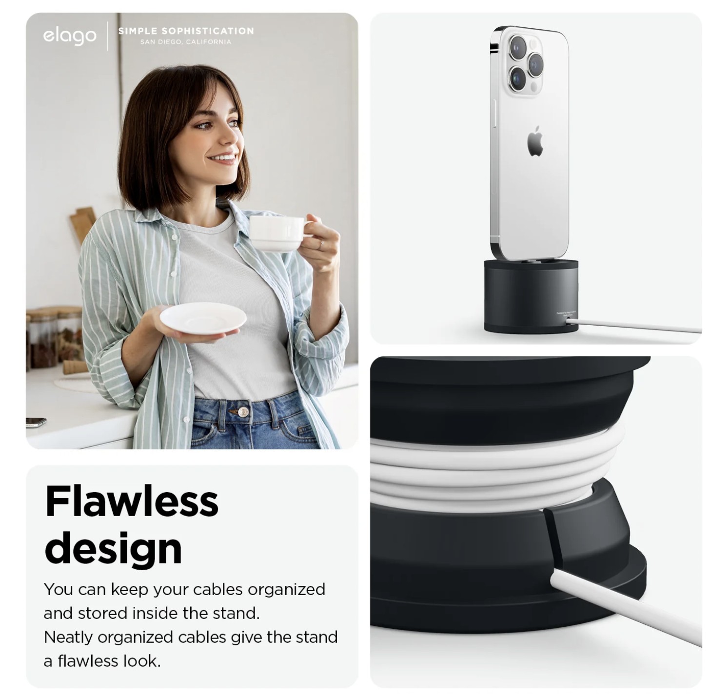 Realizzato in alluminio e silicone resistenti, questo prodotto è stato progettato per durare. L'alluminio è stato utilizzato per richiamare il design di altri prodotti simili e per conferire un aspetto elegante. Il silicone aiuta a proteggere il cavo e il dispositivo in carica da eventuali danni, proteggendo al contempo la superficie su cui poggia dai graffi.