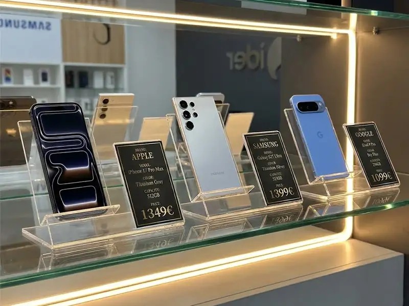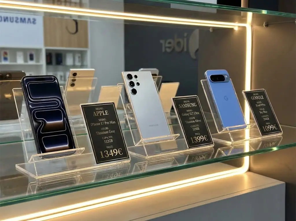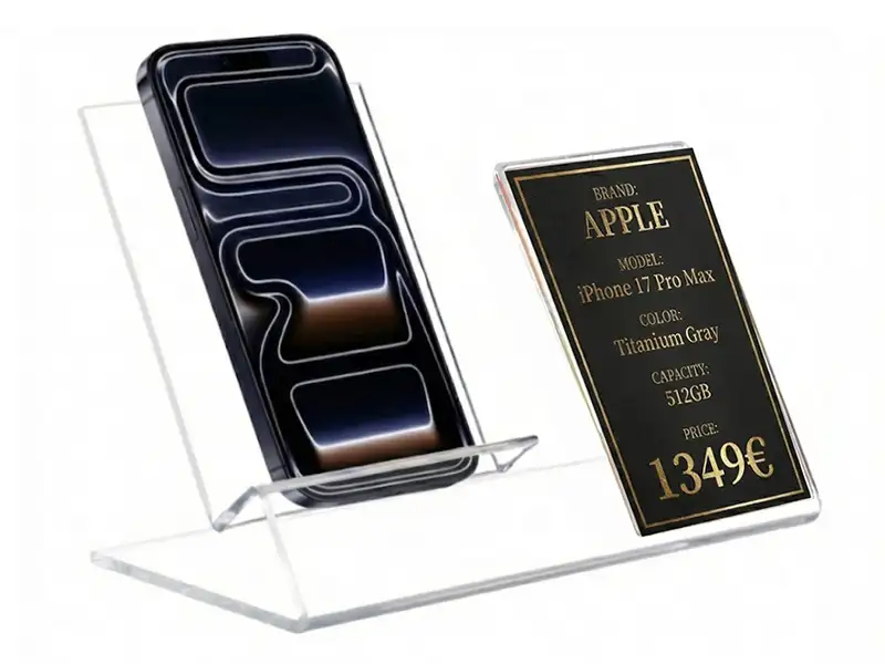 A differenza dei comuni stand, questo modello integra un porta etichetta laterale che permette di inserire cartellini con dettagli cruciali per la vendita (Brand, Modello, Configurazione/Prezzo), rendendo il prodotto "parlante" e riducendo la necessità di assistenza immediata da parte del personale.