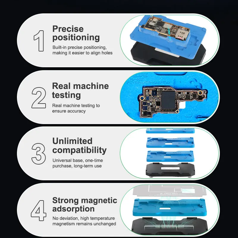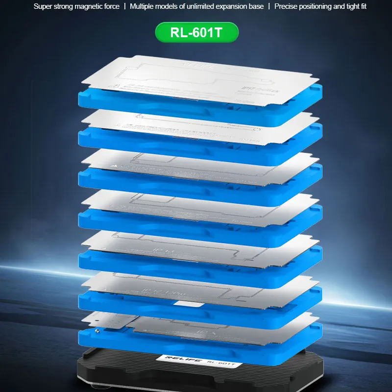 Il RELIFE RL-601T è un sistema di posizionamento magnetico ad alta precisione progettato per la riparazione dei "sandwich" (schede madri a doppio strato) degli iPhone. Questa workstation professionale copre un range vastissimo, dai modelli iPhone X fino alla serie 17 Pro Max, rendendolo l'asset più versatile per ogni laboratorio di micro-saldatura.
