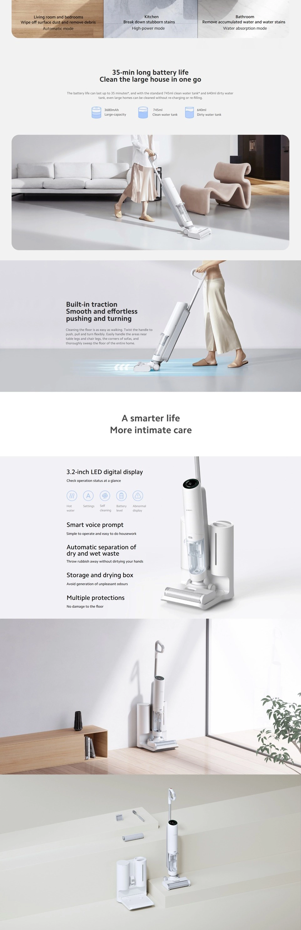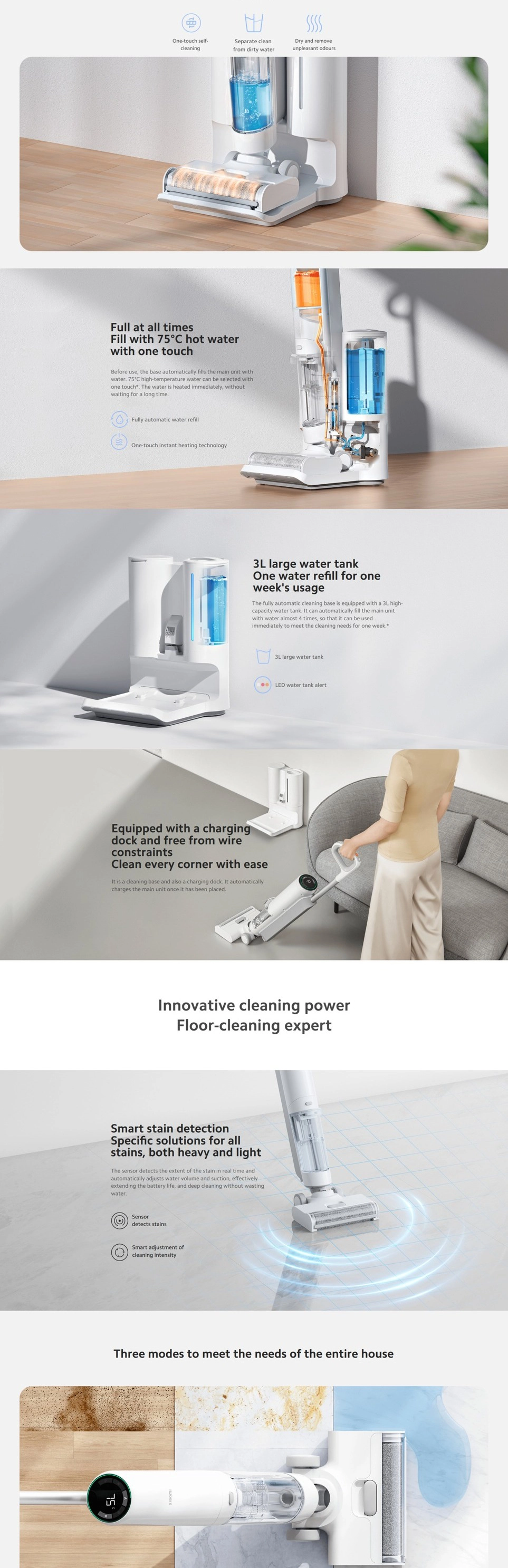 Rilevamento Intelligente dello Sporco: Grazie a sensori avanzati, la scopa rileva la quantità di sporco sul pavimento e regola automaticamente la potenza di aspirazione e il flusso d'acqua. Questo ottimizza la durata della batteria (fino a 35 minuti) e garantisce che non rimangano aloni.