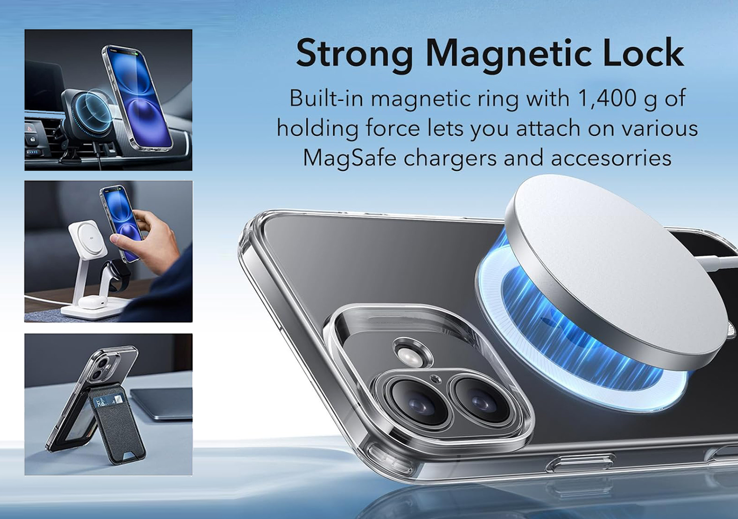 L'anello di magneti con una forza di tenuta di 1.400 g consente una ricarica wireless più rapida e un aggancio sicuro a qualsiasi accessorio MagSafe.