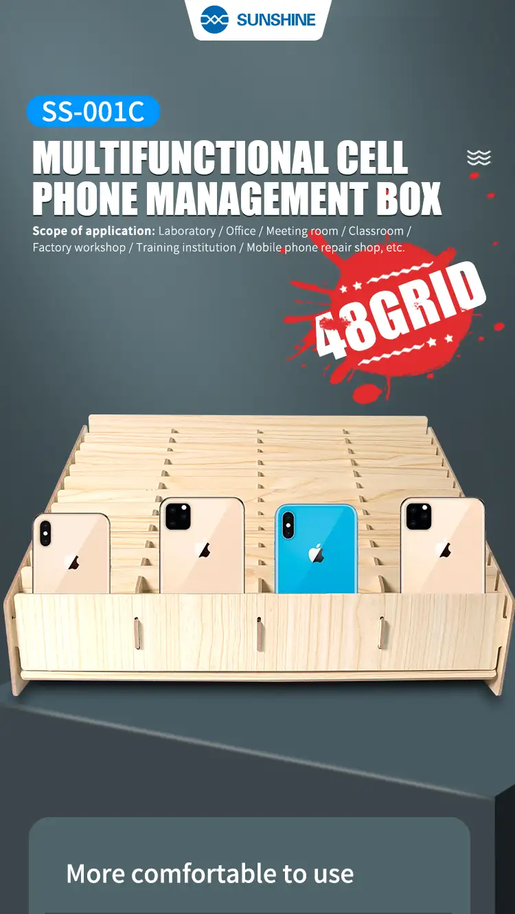 Grazie al Mobile Phone Organizer Sunshine SS-001C, è possibile classificare tutti i telefoni in pochissimo spazio, rendendoli immediati nella ricerca. Questo box raccoglitore da 48 posti è uno strumento essenziale sia nell'area riparazione, per liberare il banco da dispositivi in attesa, sia in accettazione, per una rapida consultazione e gestione delle commesse.