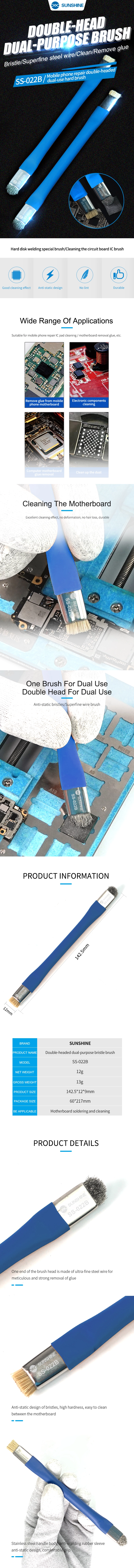 La Sunshine SS-022B è la spazzola antistatica essenziale per ogni tecnico. Dotata di setole rigide ma sicure, è progettata specificamente per rimuovere residui di flussante, pasta saldante e ossido dalle schede madri dopo la lavorazione. Design ESD-Safe per proteggere i componenti sensibili.